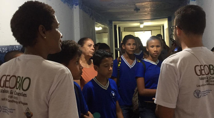 A atividade cadastrada pelo Dia Mundial do Solo (WSD-2019): “Live soil in the Geodiversity of Alagoas” faz parte das ações do Projeto de Extensão: Geodiversidade e Biodiversidade: valores e conexões do Edital ProCCAEXT 2018-19 da UFAL (CECA). O objetivo do projeto foi criar dois espaços didáticos vinculados ao laboratório de Geologia e Recursos Naturais do CECA (LABGREN). Os espaços didáticos foram criados ao longo de 2019. Sendo abertos à comunidade escolar dos arredores do CECA, do município e da região, no marco das atividades em comemoração ao Dia Mundial do Solo (WSD) e durante o II Congresso Alagoano de Engenharia de Agrimensura (II CONEAGRI). No dia 03/12/2019 foram recebidas pelos extensionistas do projeto, 60 crianças do ensino fundamental I, com 3 professores da escola municipal Gustavo Paiva, a qual se encontra ao lado do centro. Foi apresentado na área verde do centro, vídeo para as crianças sobre a importância da água para a vida e também o seu papel na erosão acelerada do solo. No espaço GeoBio1 – Corredor da Geodiversidade vinculado ao LABGREN foi apresentada exposição do Sistema Terra. Contendo explanação desde a Formação do Sistema Solar, até a solidificação da terra e a crosta como berço das rochas e minerais que dão origem aos nossos solos, ao longo do tempo Geológico. Constatado em campo, no espaço GeoBio2, o qual conta com horta e Sistema Agroflorestal (SAF) atendido por estudantes de Agroecologia e demais cursos do CECA. No local, as crianças plantaram mudas de melancia, abóbora e mamão. No dia 04/12 a celebração pelo WSD teve a participação de 55 crianças e 3 professoras do Centro Educacional municipal Luiz de Amorim Leão.